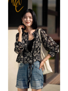 哥家商场同款女装2025秋季黑底印花通勤时髦长袖抽绳上衣衬衫