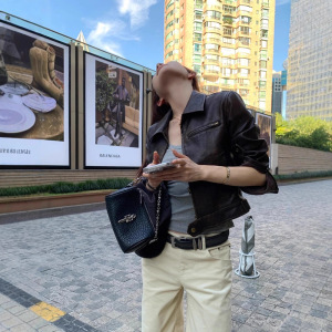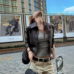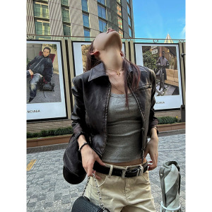 酷飒风美式短款皮衣外套女早秋季装新款修身显瘦复古机车夹克上衣