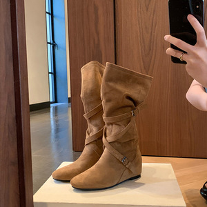 2025秋冬新款尖头增高6cm~ 韩系圆头扣带柔软褶皱显瘦中筒靴女