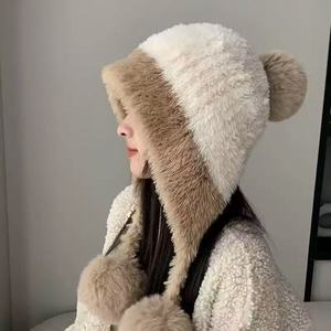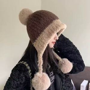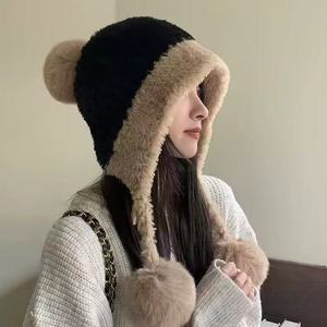 冬季可爱大头围帽子小熊毛球绒女款加绒护耳雷锋针织保暖包头毛线