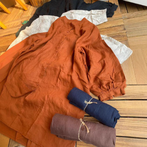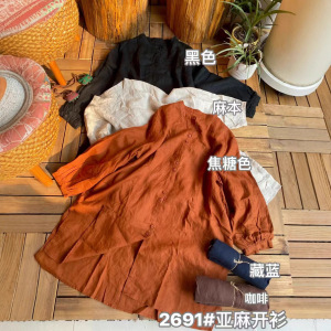 秋季新款 文艺简约大版亚麻衬衫 圆领宽松休闲气质开衫衬衣