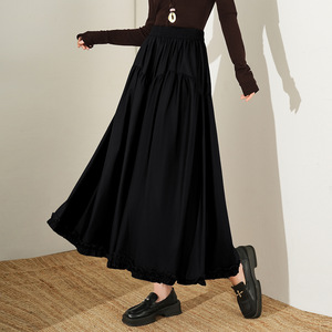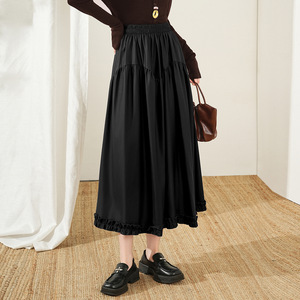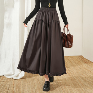 秋冬季新款韩系木耳边皮裙A字长款半身裙2025宽松休闲百褶裙长裙