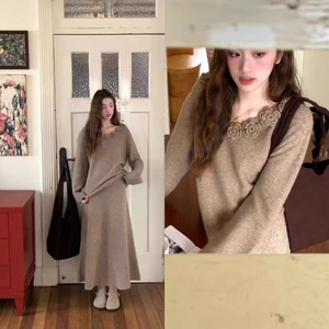 温柔山茶花V领针织套装女上衣高腰鱼尾长半裙2025秋冬减龄两件套
