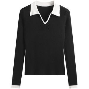 撞色POLO领针织衫女半开领长袖套头打底衫女修身显瘦气质上衣女