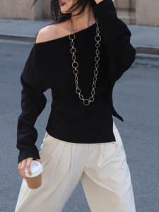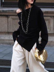 氛围感出街系列 不对称露肩上衣下摆开衩收腰褶皱卫衣女春秋