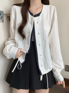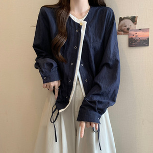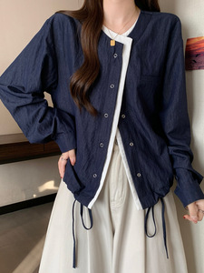 设计感小众假两件抽绳衬衫女春秋季大码胖mm显瘦休闲夹克开衫短外