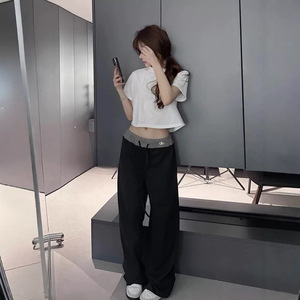 al*25秋新款抽绳百搭拼接高腰直筒宽松休闲阔腿显瘦健身运动裤女