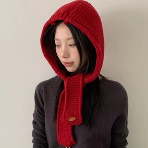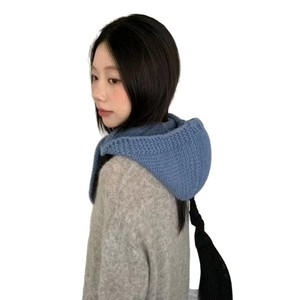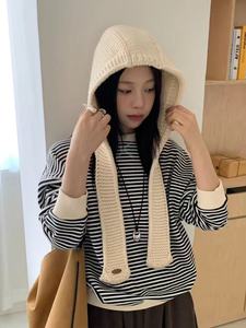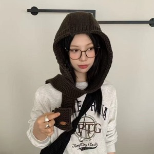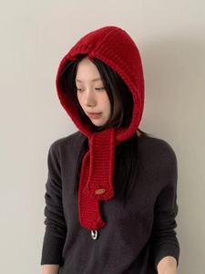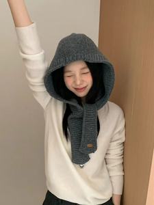 韩代同款~手工粗毛线棒针帽子围巾一体保暖羊毛护耳巴拉克拉法帽
