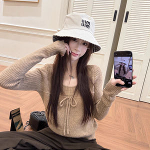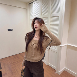 实拍 韩版设计感拼接温柔蝴蝶结系带针织衫上衣女秋冬设计感毛衣