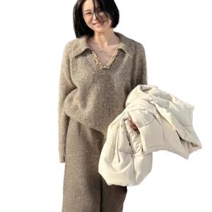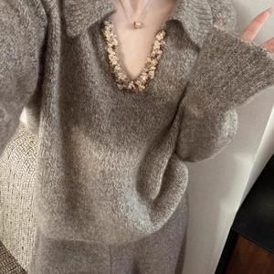 灰色亮片v领翻领毛衣时尚深秋初冬穿搭慵懒感超好看宽松针织衫女