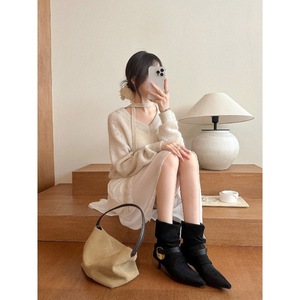 一眼爱上!枫叶棕尖头金属短靴女两穿复古绒面时装靴