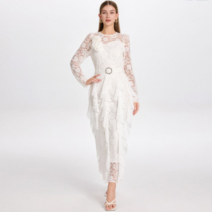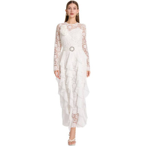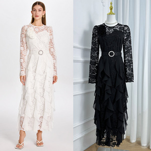圆领长袖镂空蕾丝拼接收腰荷叶边大摆公主风礼服时尚连衣裙女秋季