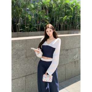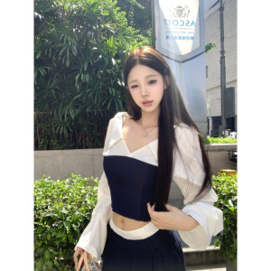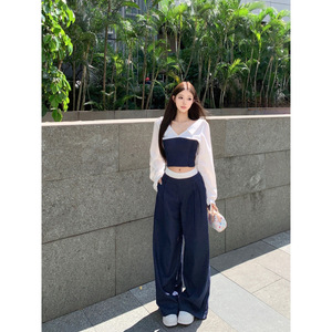 忆可达 松弛慵懒假两件拼色修身白衬衫上衣+休闲直筒长裤套装