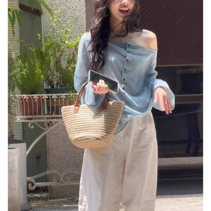 蓝色半开领一字肩长袖T恤女秋季巨好看的慵懒风防晒罩衫薄纱上衣