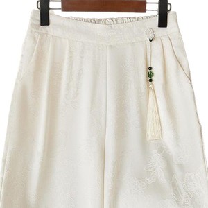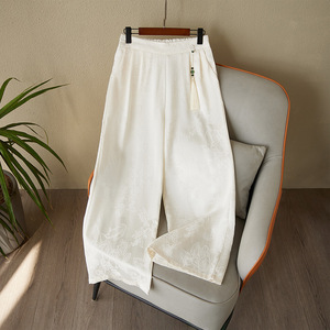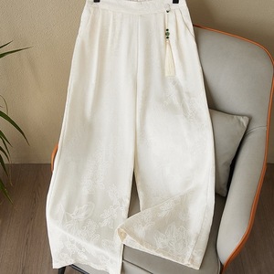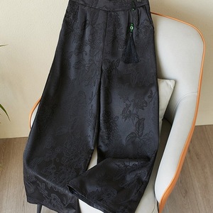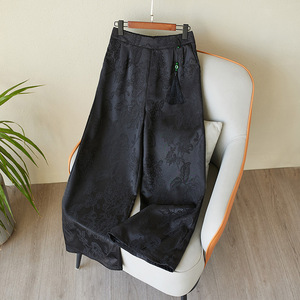 2025夏季新款新中式缎面提花松紧腰休闲阔腿裤复古国风宽松长裤女