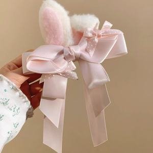 粉色蝴蝶结毛绒兔耳朵发夹女可爱边夹侧边刘海夹洛丽塔公主头饰