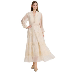 法式复古V领蕾丝拼接收腰长袖大摆连衣裙女显瘦高级感优雅长裙子