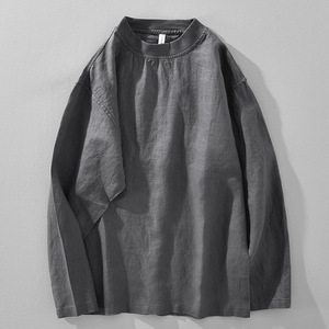 Y2519四季款老钱风宽松白色亚麻长袖T恤衫男士打底柔软卫衣男外套
