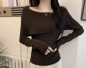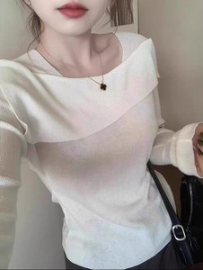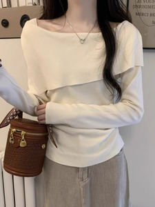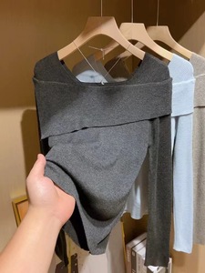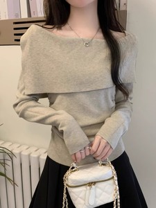 设计感一字肩翻领长袖针织衫女春秋内搭修身甜辣打底毛衣外穿上衣
