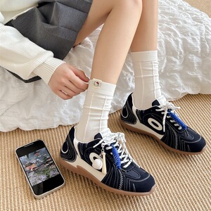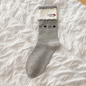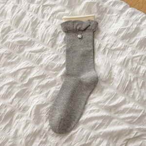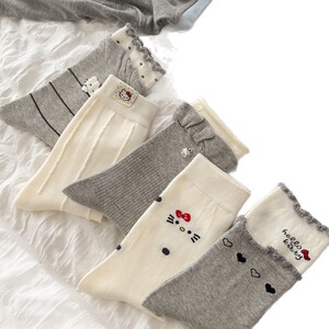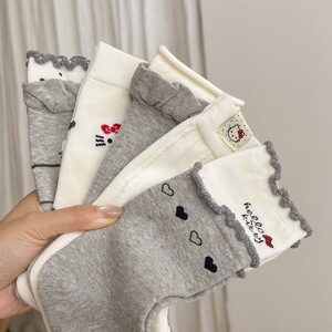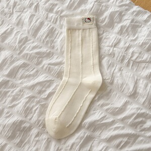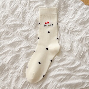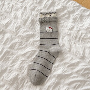 无骨袜子女条纹可爱猫咪刺绣纯棉中筒袜新款日系卡通堆堆袜长袜子