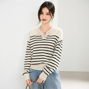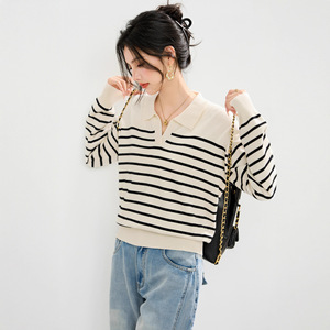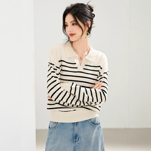 polo领黑白条纹长袖针织衫女装2025新款秋冬小个子短款毛衣打底衫