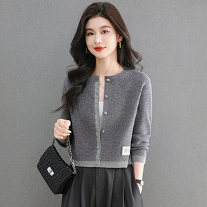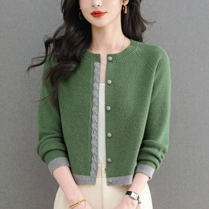 早秋季撞色针织开衫2025女士显高拼接毛衣蕾丝边纽扣圆领小外套潮
