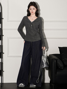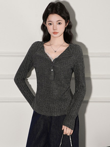 季优 深灰半开领蕾丝拼接长袖打底衫女春秋季纯欲收腰叠穿内搭T恤