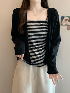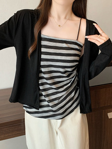 2025年秋装新款胖mm大码女休闲吊带条纹背心开衫外套气质两件套