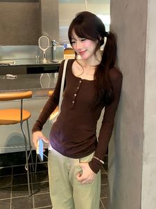 美式复古咖色长袖t恤女春秋新款修身显瘦辣妹设计感打底内搭上衣