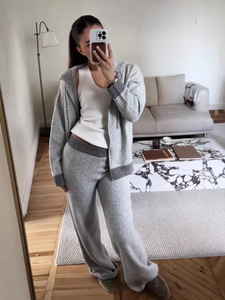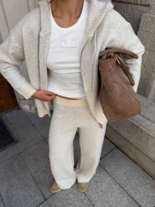 连帽拉链针织开衫毛衣套装女秋冬25新款慵懒风撞色休闲长裤两件套