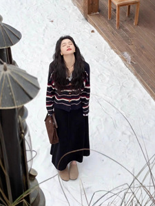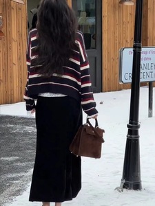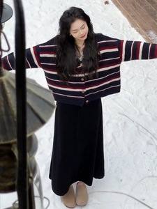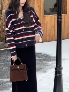 条纹设计时髦显瘦条纹开衫上衣 +百搭松紧腰弹力针织小黑裙