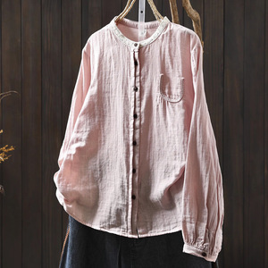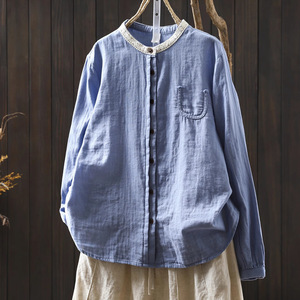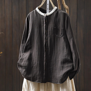 大码双层棉纱小衫女春秋新款棉质蕾丝小立领拼接文艺气质减龄衬衫