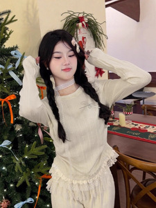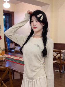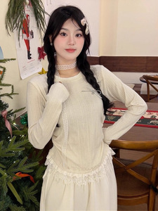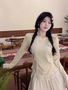 法式假两件蕾丝边拼接打底衫女秋冬内搭蝴蝶结修身别致甜美上衣潮