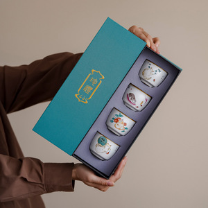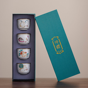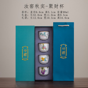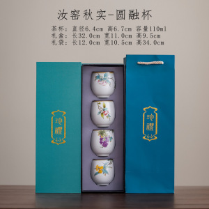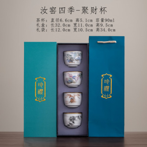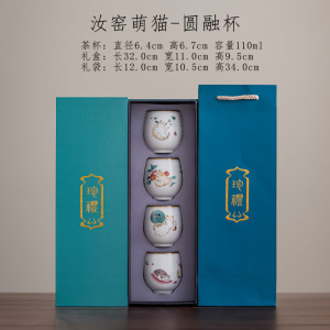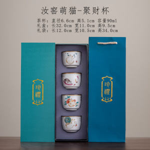 汝窑月白猫咪茶杯四杯礼盒装主人杯公司会议国庆企业定LOGO伴手礼
