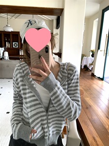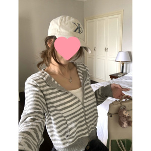 跨境可可里~条纹连帽长袖针织衫外套女秋季新韩系慵懒短开衫衣白