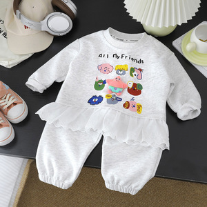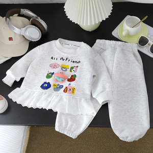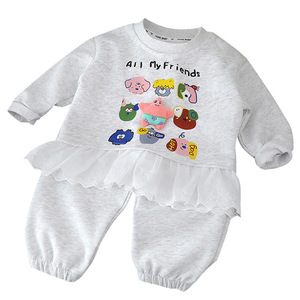 女童卫衣套装新款卡通蕾丝花边华棉女宝韩版印花玩偶卫裤两件套