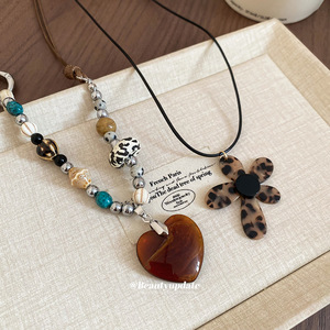 陶瓷石头木头串珠爱心花朵吊坠项链民族风颈链小众设计感毛衣链女