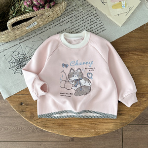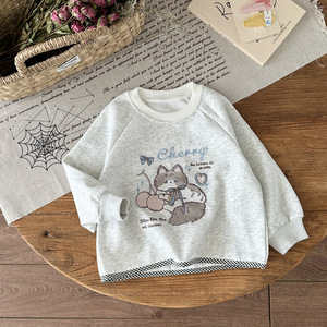 韩国女童秋季卫衣新品儿童萌猫咪印花长袖格子下摆可爱上衣打底衫
