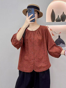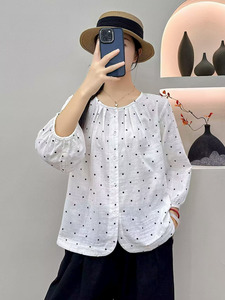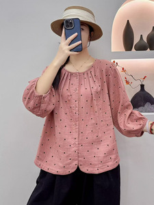 文艺小碎花印花圆领双层棉纱衬衫女秋季新款宽松大码休闲显瘦上衣