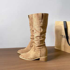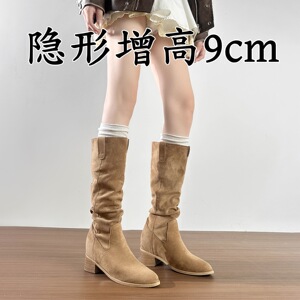 马丁靴褶皱堆堆靴内增高新款秋冬粗跟V口显瘦长筒中筒复古牛仔靴