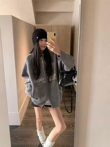 2025新款美式复古竖条纹立领毛衣外套女秋季宽松显瘦气质灰色上衣
