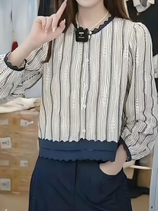 2025秋季新款女巨好看短款小衫蕾丝花边长袖衬衫法式小众条纹上衣