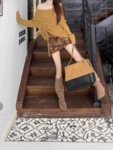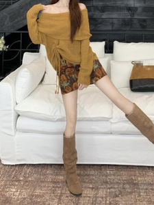 美拉德一字肩长袖针织衫上衣碎花半身裙短裙女2025秋季新款两件套