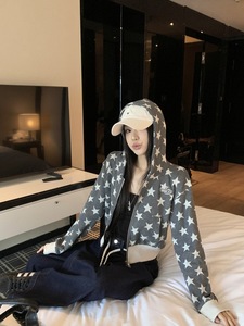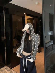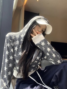 复古灰色星星连帽长袖卫衣外套女秋季美式宽松慵懒风休闲开衫上衣