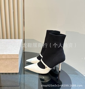 高端2025秋冬真皮尖头拼色细跟针织弹力高跟短靴瘦瘦靴时装单靴女