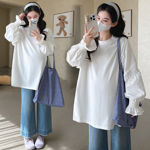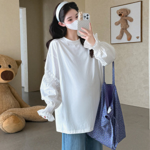 孕妇秋冬款白色打底T恤宽松大板型蕾丝拼接遮臀休闲时尚打底上衣