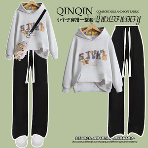 秋季新款美式格子拼接刺绣连帽卫衣套装女小个子宽松阔腿裤两件套