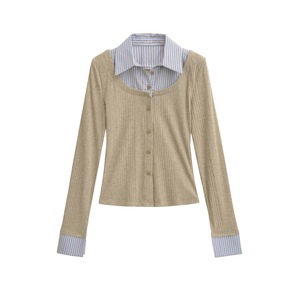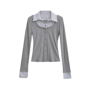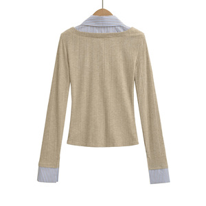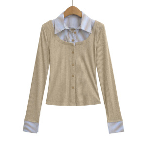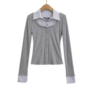韩版复古假两件拼接撞色衬衫领长袖T恤女单排扣修身辣妹开衫上衣