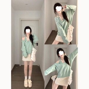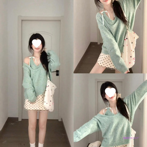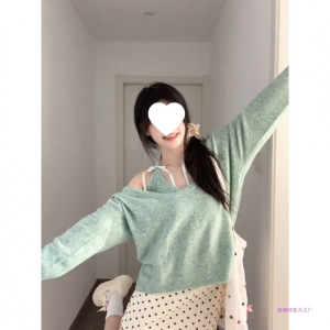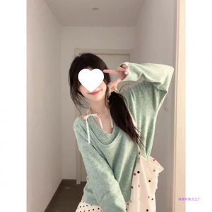 绿色V领软糯套头毛衣女早秋季新款韩系穿搭套装慵懒风针织衫上衣