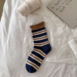 ins日系卷边撞色复古条纹中筒女袜文艺小众咖色系经典条纹堆堆袜
